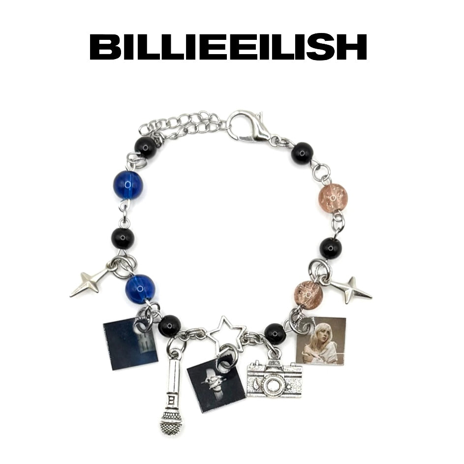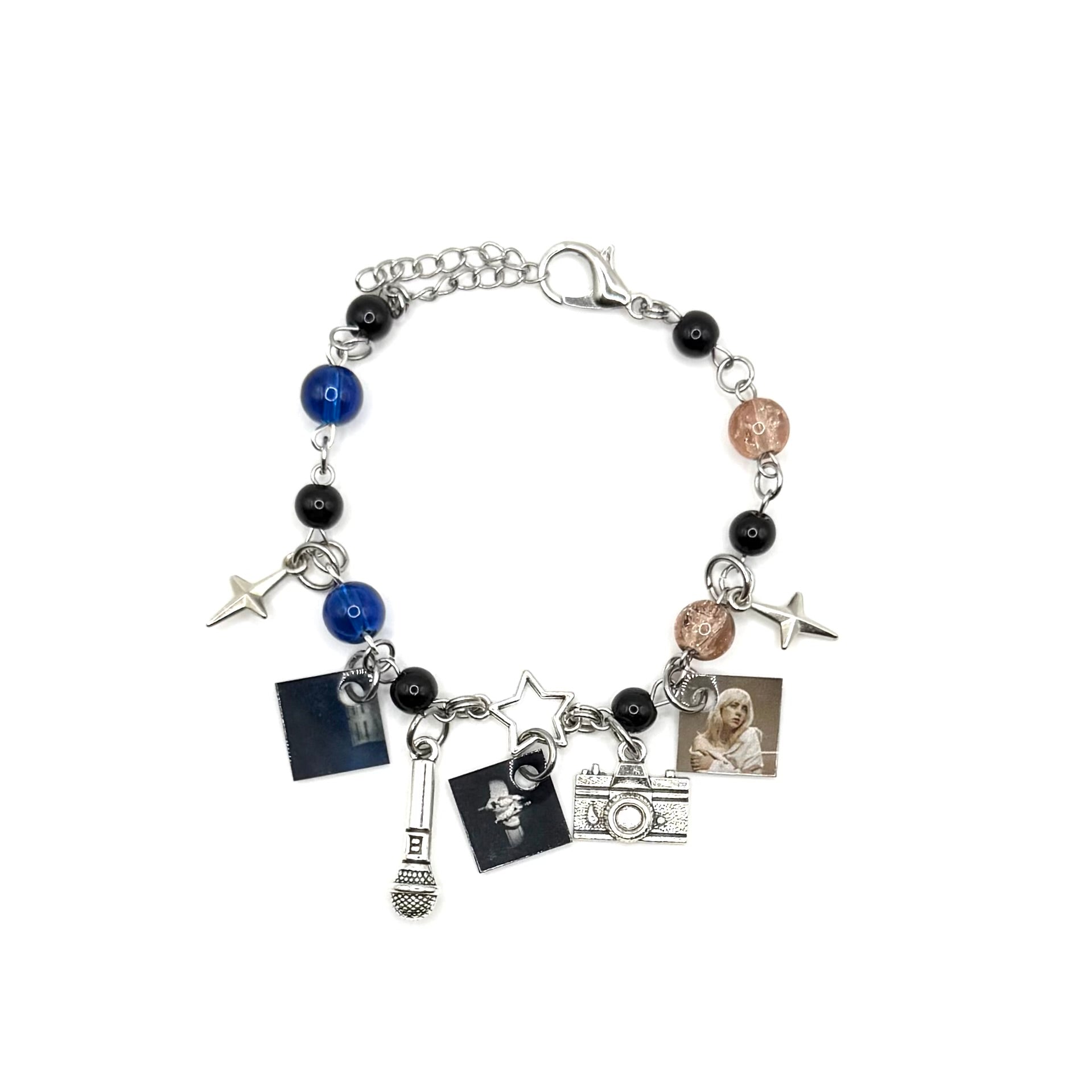 This cute charm bracelet features tiny (0.5”!) double sided albums crafted from high quality aluminum among various beads and charms. Lobster claw closure for easy wear. Adorable concert accessory or just to show off your love for music.