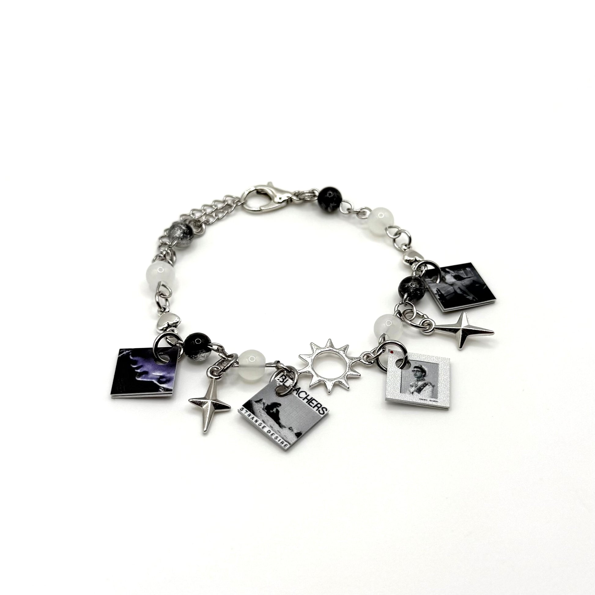 This cute charm bracelet features tiny (0.5”!) double sided albums crafted from high quality aluminum among various beads and charms. Lobster claw closure for easy wear. Adorable concert accessory or just to show off your love for music.