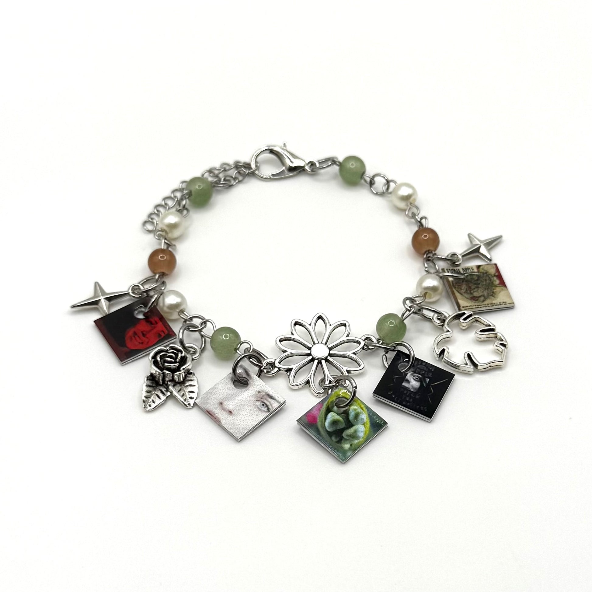 This cute charm bracelet features tiny (0.5”!) double sided albums crafted from high quality aluminum among various beads and charms. Lobster claw closure for easy wear. Adorable concert accessory or just to show off your love for music.