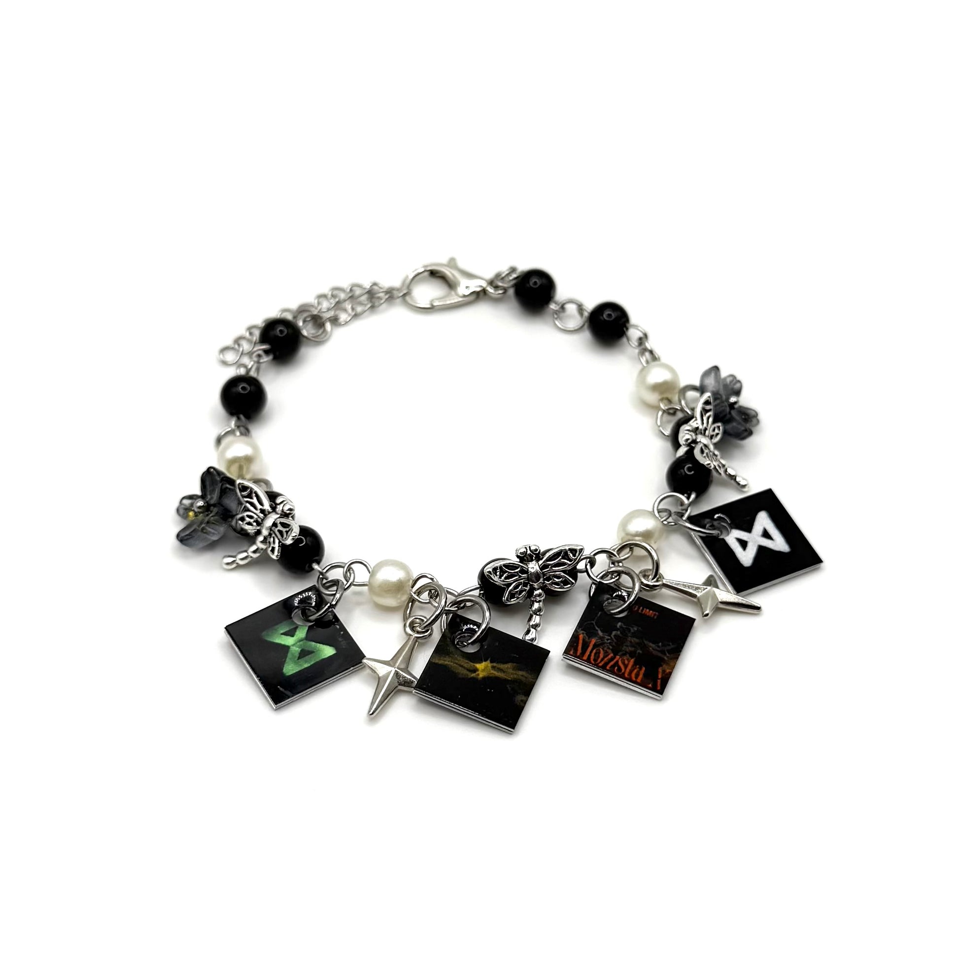 This cute charm bracelet features tiny (0.5”!) double sided albums crafted from high quality aluminum among various beads and charms. Lobster claw closure for easy wear. Adorable concert accessory or just to show off your love for music.