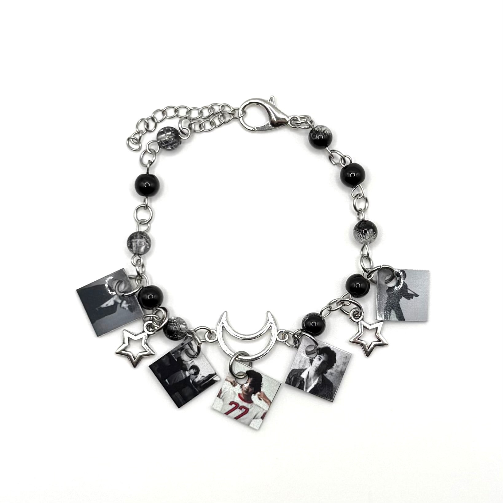 This cute charm bracelet features tiny (0.5”!) double sided albums crafted from high quality aluminum among various beads and charms. Lobster claw closure for easy wear. Adorable concert accessory or just to show off your love for music.