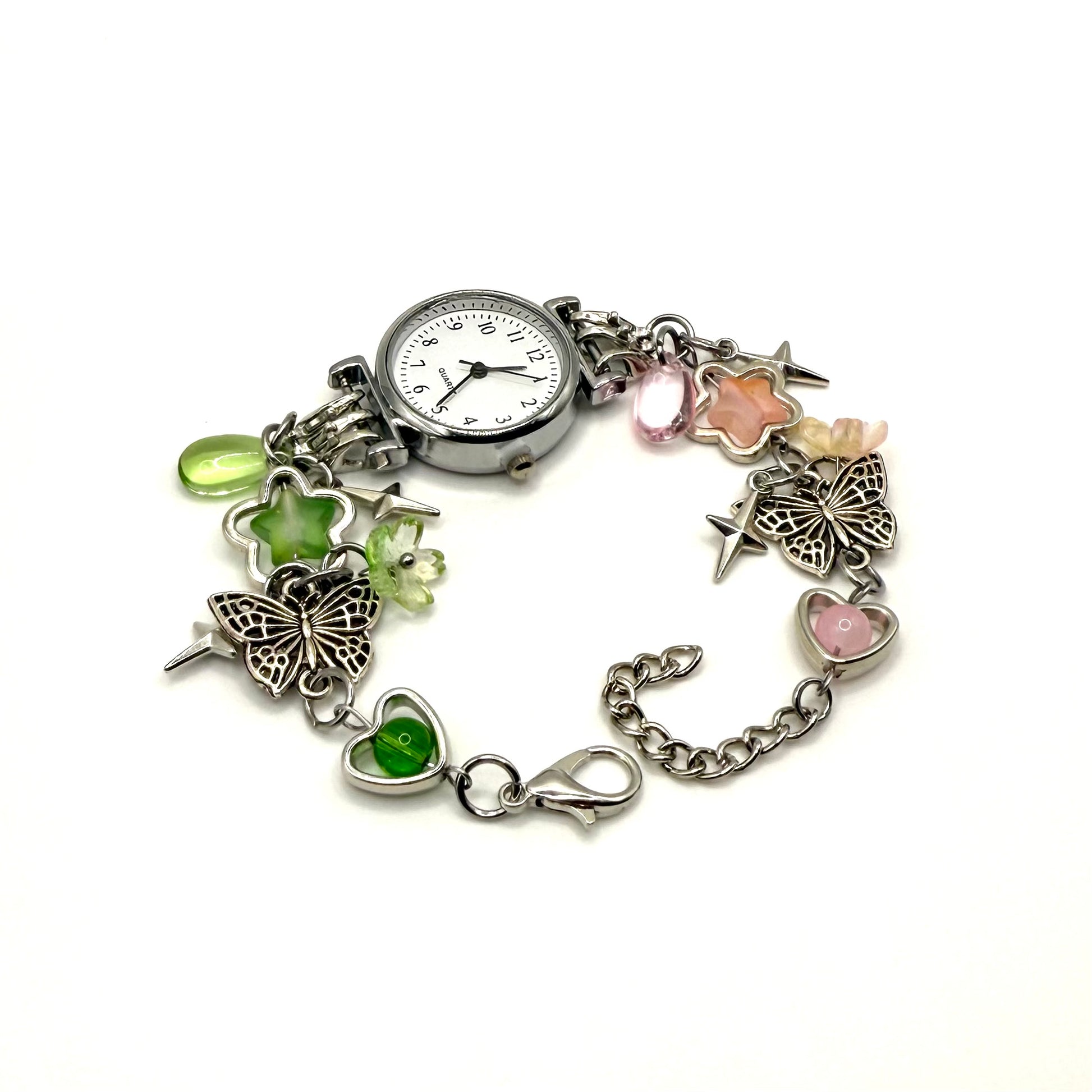 Stylish fully functional analog watch charm bracelet for a unique blend of fashion and function. Featuring various charms, beads, and a classic watch face. Perfect gift idea or outfit accessory.